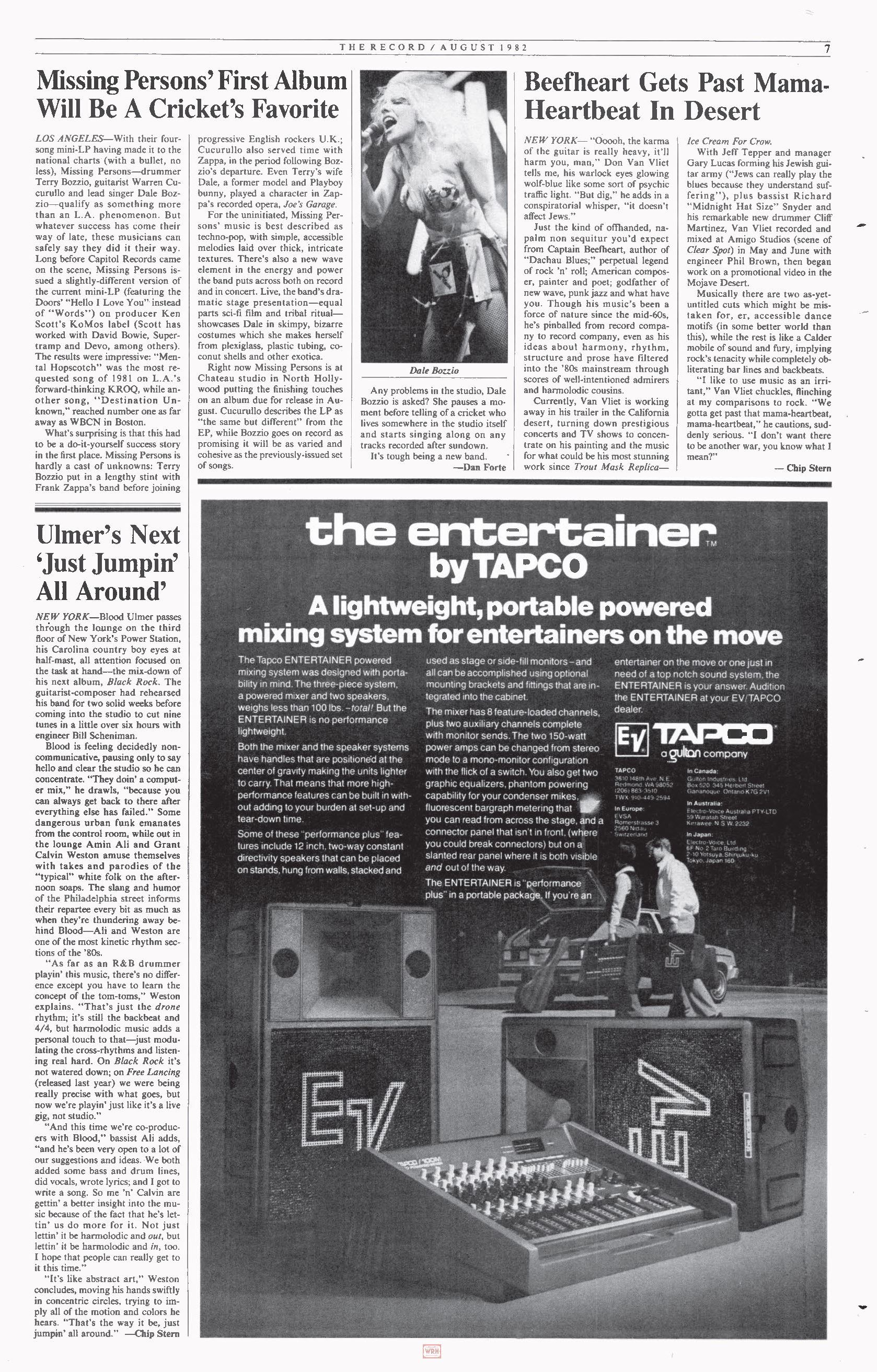 Frank Zappa fans should be on the lookout for an EMI release later this year of three Zappa compositions performed by conductor Pierre Boulez' chamber orchestra The Ensemble Intercontemporain, with Boulez conducting, January 9 at Theatre De La Ville in Paris. Recorded on January 10 and 11 at the IRCAM Studios in the Pompidou Center in Paris, the LP will include "The Perfect Stranger," which Boulez commissioned to accommodate the 29-piece instrumentation used by his orchestra, plus "Naval Aviation In Art?" and "Dupree's Paradise," both Zappa compostions. This is hardly Zappa's first foray outside of rock. Last year he released an album of orchestral works recorded by the London Symphony Orchestra on his Barking Pumpkin label (distributed by CBS). Titled The London Symphony Orchestra, Zappa, Vol . 1, the LP features the world premieres of "Sad Jane," "Pedro's Dowry," "Envelopes" and "Mo 'N Herb's Vacation," which were performed by the LSO in an all-Zappa musical evening in January of 1983. Zappa has also been invited by composer Luciano Berio to guest conduct at the Magghio Musicale Fiorentino, 1984 (Florence May Festival); he has also been asked to guest conduct for the Honolulu Symphony 1984/85 season and to conduct his own music and selections from Edgar Varese at the University of Buffalo in 1985. And sometime this year he's going to release a rock album. This is a busy man.