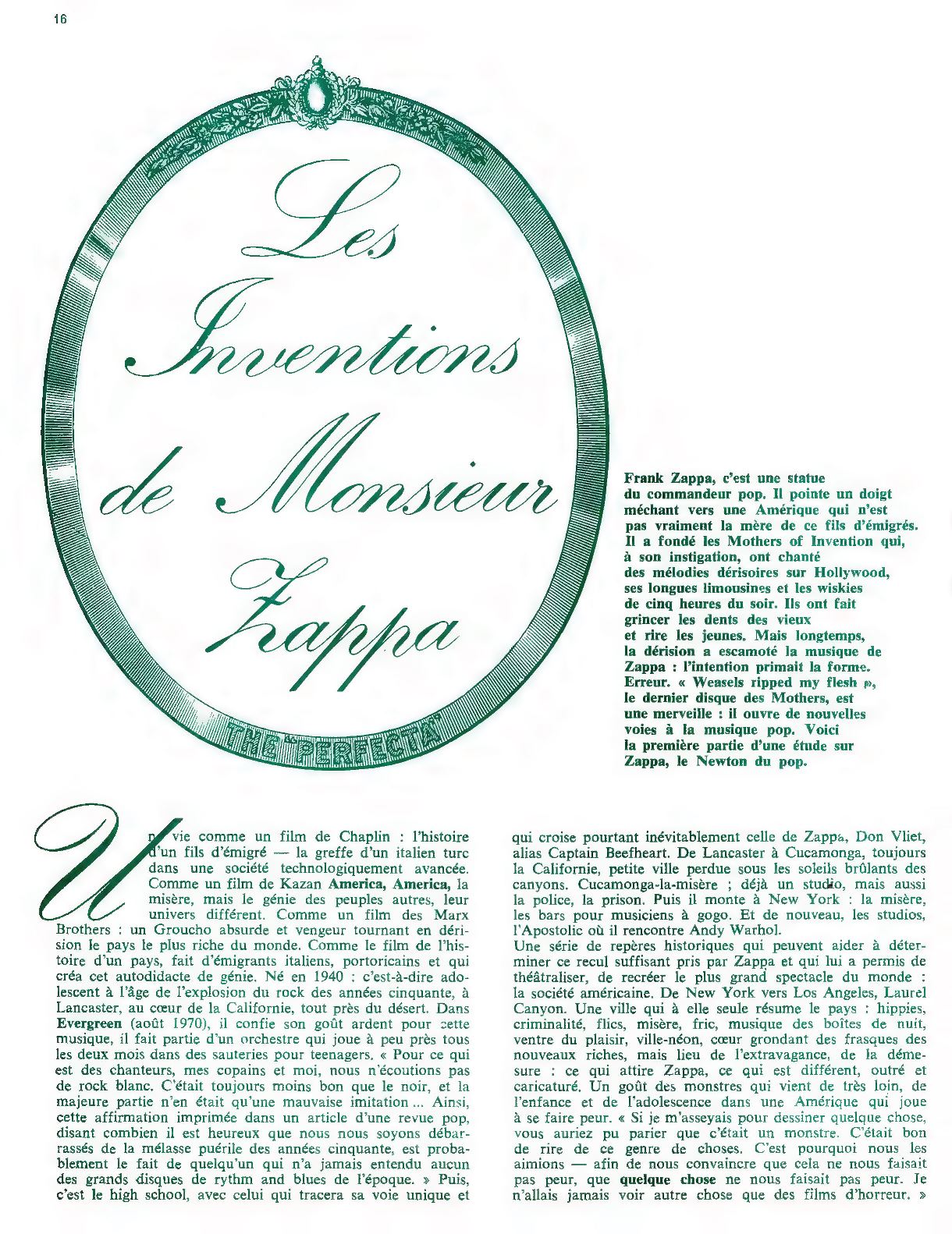 Frank Zappa is a pop icon. He points a nasty finger at an America that isn't exactly the mother of this son of immigrants. He founded the Mothers of Invention, who, at his instigation, sang satirical melodies about Hollywood, its long limousines, and five o'clock-afternoon whiskeys. They made the old folks cringe and the young laugh. But for a long time, the sarcasm overshadowed Zappa's music: intention took precedence over form. A mistake. "Weasels Ripped My Flesh," the Mothers' last album, is a marvel: it opens new avenues for pop music. This is the first part of a study on Zappa, the Newton of pop.