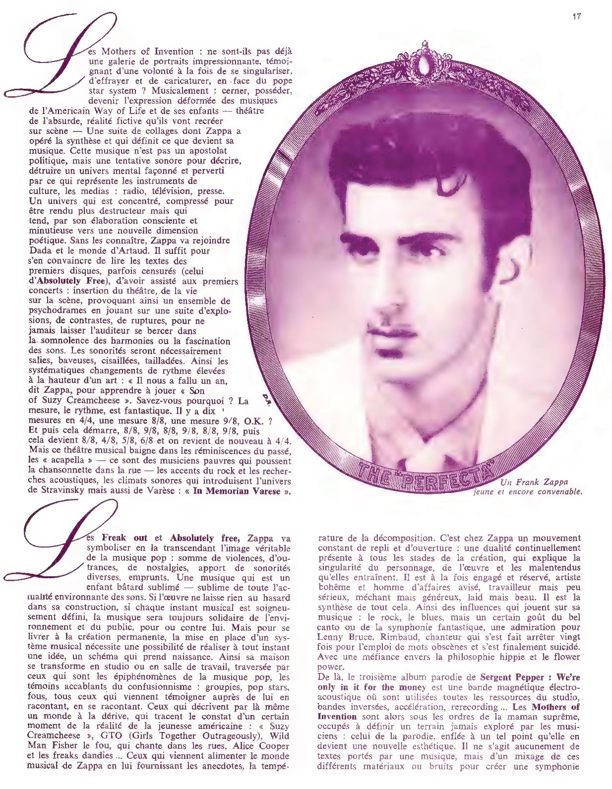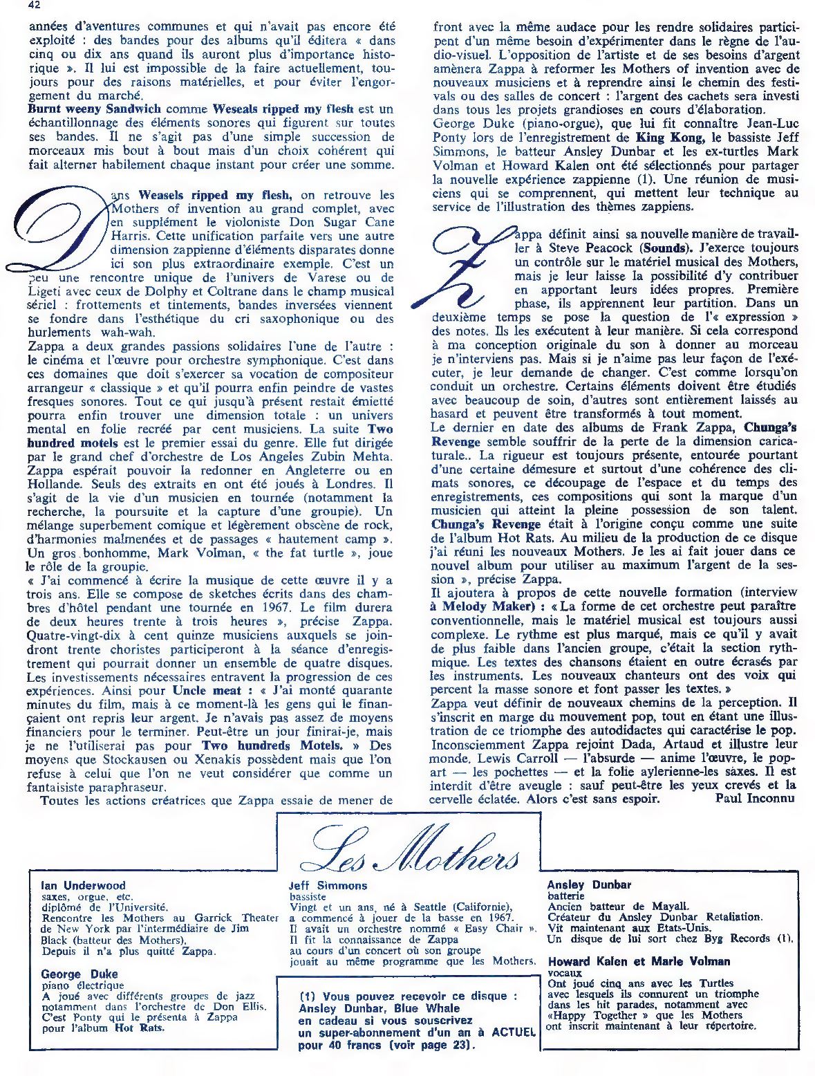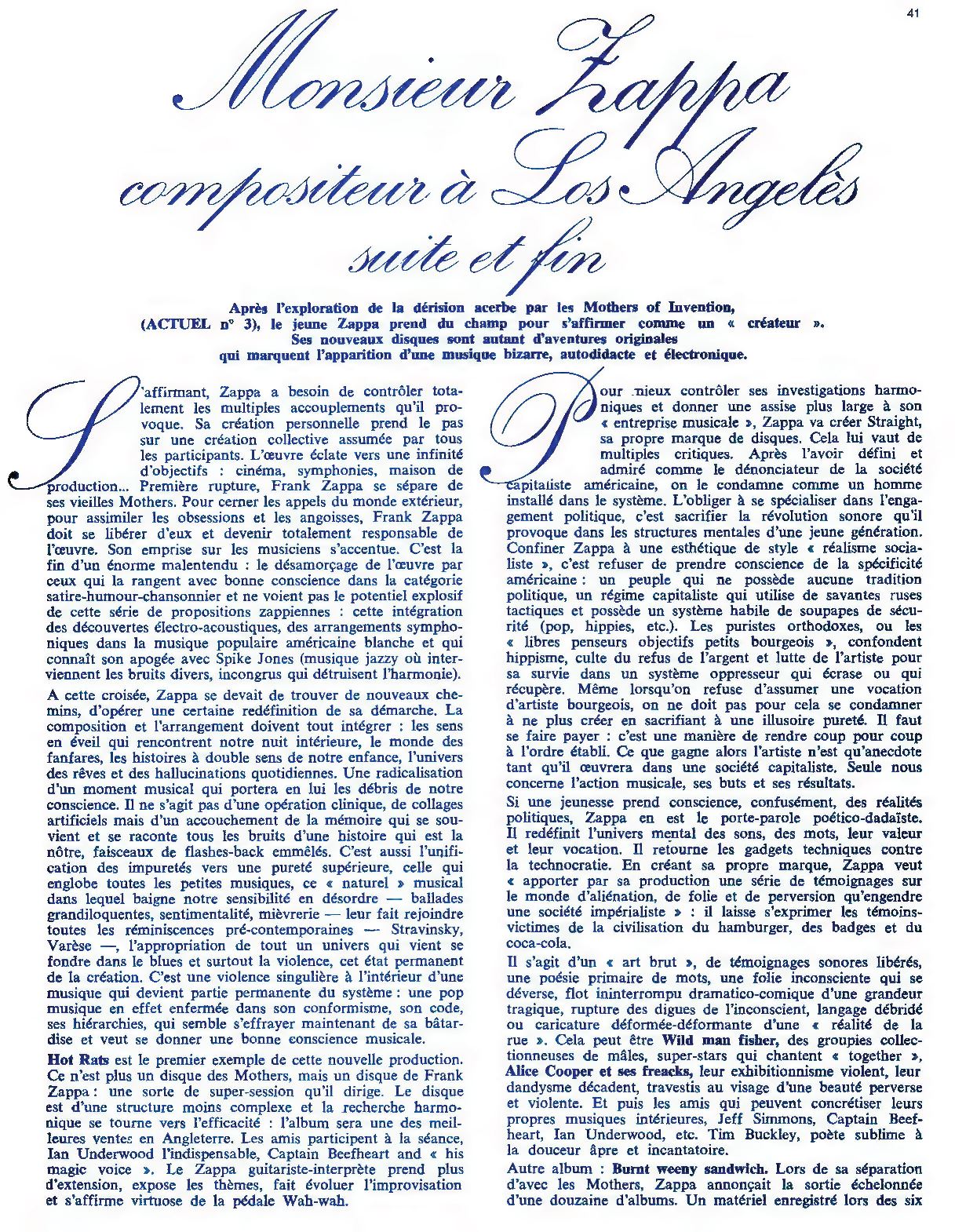 After the Mothers of Invention's exploration of biting satire ( Actuel no. 3 ), the young Zappa took a step back to establish himself as a "creator." His new records were all original adventures that marked the emergence of a bizarre, self-taught, and electronic music.