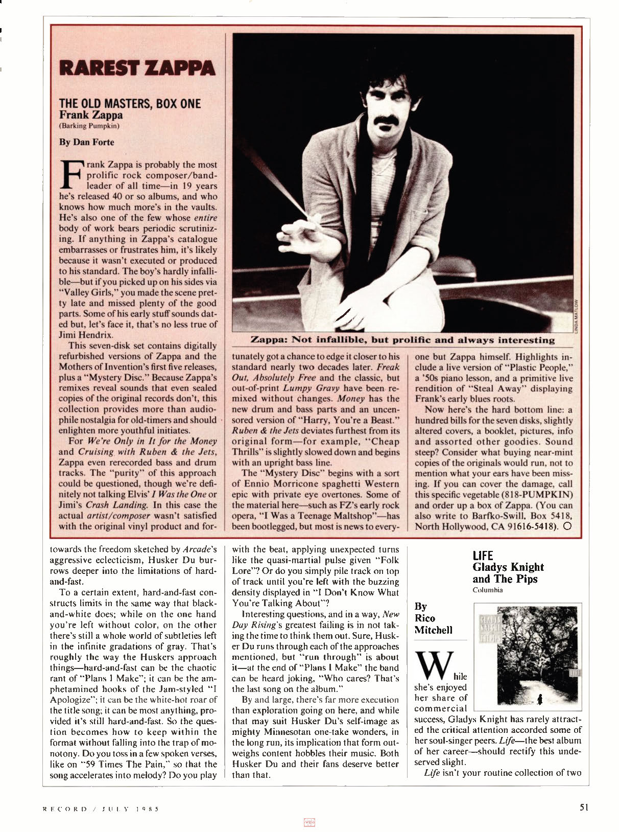 Frank Zappa fans should be on the lookout for an EMI release later this year of three Zappa compositions performed by conductor Pierre Boulez' chamber orchestra The Ensemble Intercontemporain, with Boulez conducting, January 9 at Theatre De La Ville in Paris. Recorded on January 10 and 11 at the IRCAM Studios in the Pompidou Center in Paris, the LP will include "The Perfect Stranger," which Boulez commissioned to accommodate the 29-piece instrumentation used by his orchestra, plus "Naval Aviation In Art?" and "Dupree's Paradise," both Zappa compostions. This is hardly Zappa's first foray outside of rock. Last year he released an album of orchestral works recorded by the London Symphony Orchestra on his Barking Pumpkin label (distributed by CBS). Titled The London Symphony Orchestra, Zappa, Vol . 1, the LP features the world premieres of "Sad Jane," "Pedro's Dowry," "Envelopes" and "Mo 'N Herb's Vacation," which were performed by the LSO in an all-Zappa musical evening in January of 1983. Zappa has also been invited by composer Luciano Berio to guest conduct at the Magghio Musicale Fiorentino, 1984 (Florence May Festival); he has also been asked to guest conduct for the Honolulu Symphony 1984/85 season and to conduct his own music and selections from Edgar Varese at the University of Buffalo in 1985. And sometime this year he's going to release a rock album. This is a busy man.