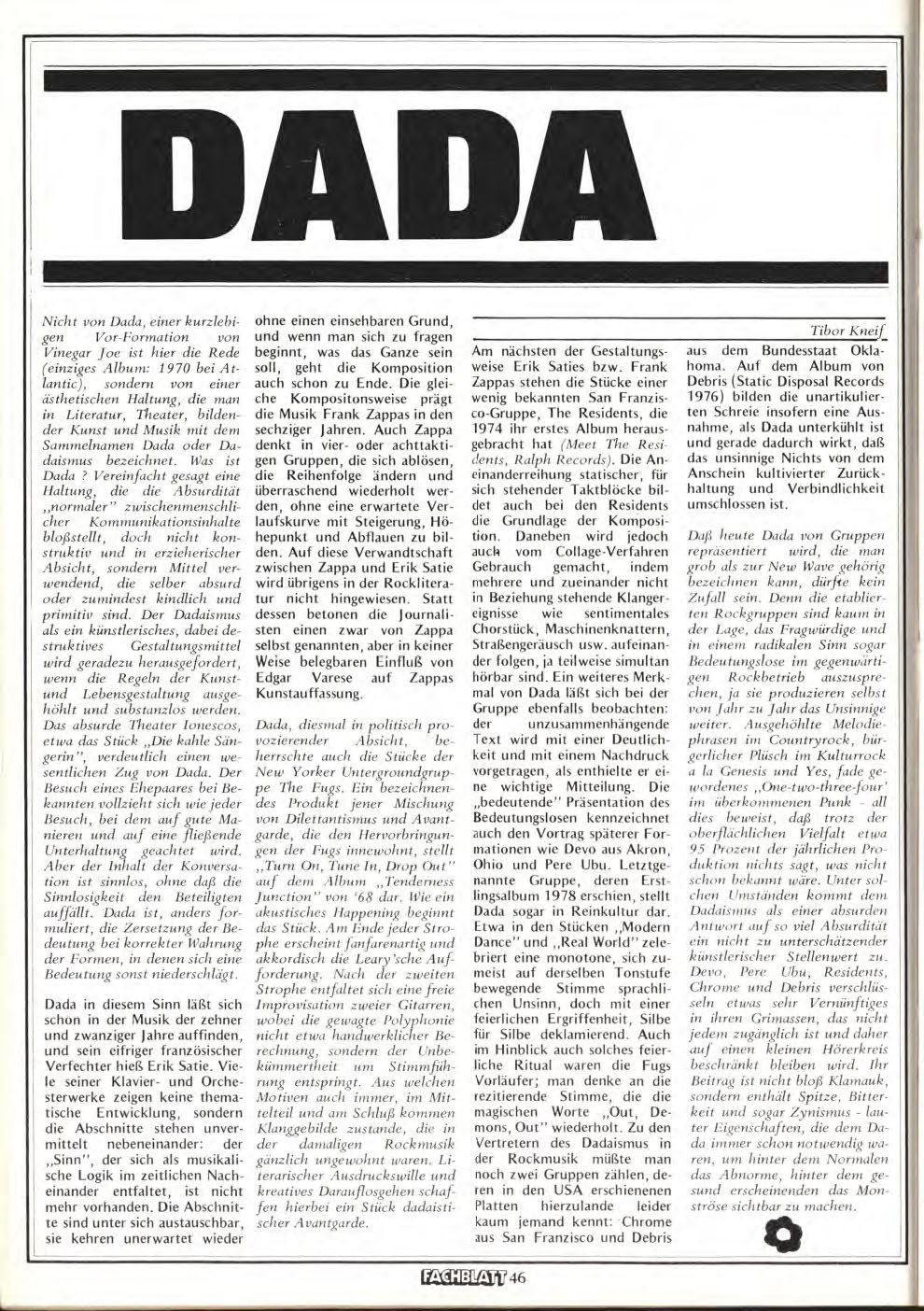 Automatic translation: Dada in this sense can already be found in the music of the 1910s and 1920s, and its ardent French advocate was Erik Satie. Many of his piano and orchestral works show no thematic development; instead, the sections stand side by side without any apparent connection: the "meaning" that unfolds as musical logic in temporal succession is no longer present. The sections are interchangeable, they reappear unexpectedly without any discernible reason, and just when one begins to wonder what the whole thing is supposed to be, the composition is already over. The same compositional style characterizes the music of Frank Zappa in the 1960s. Zappa, too, thinks in four- or eight-bar groups that succeed one another, change order, and are surprisingly repeated without forming an expected trajectory with crescendo, climax, and ebb. Incidentally, this affinity between Zappa and Erik Satie is not mentioned in rock literature. Instead, the journalists emphasize an influence of Edgar Varèse on Zappa's artistic vision, which was mentioned by Zappa himself but cannot be proven in any way.