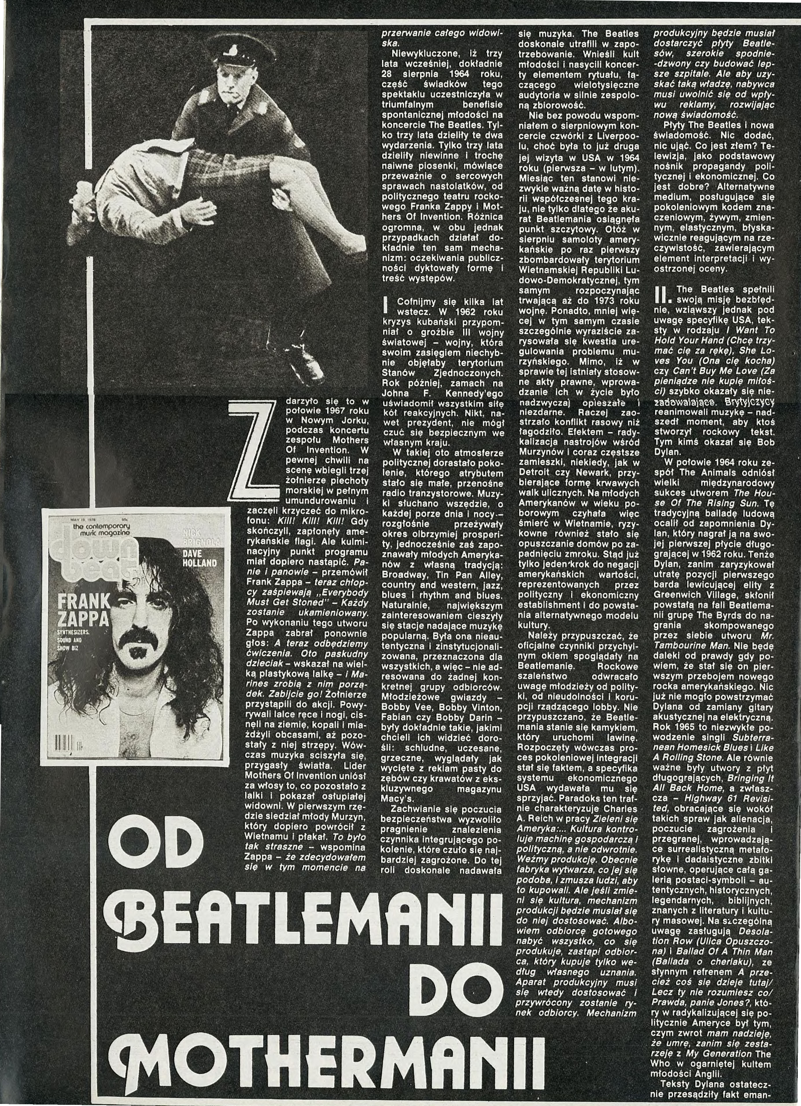 Automatic translation: It's truly difficult to imagine what the entire genre would look like today were it not for Bob Dylan's lyrics and Frank Zappa's bold formal experiments. Sticking with The Beatles, whose work is widely considered a symbol of 1960s rock, there's no doubt that without "Like a Rolling Stone" and "Highway 61 Revisited", the songs on Revolver would have been different, and without Freak Out! there would have been no Sgt. Pepper's Lonely Hearts Club Band. (read more)